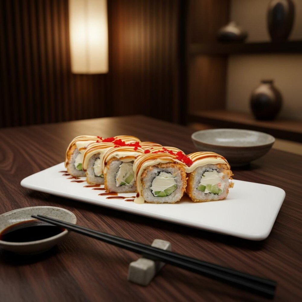 Новый горячий Шик - вкусное морское блюдо с лососем и хрустящим кляром. Состав блюда: лист нори, икра тобико, лосось, огурец свежий, сыр творожный, сладкий соус, соус унаги, кляр.