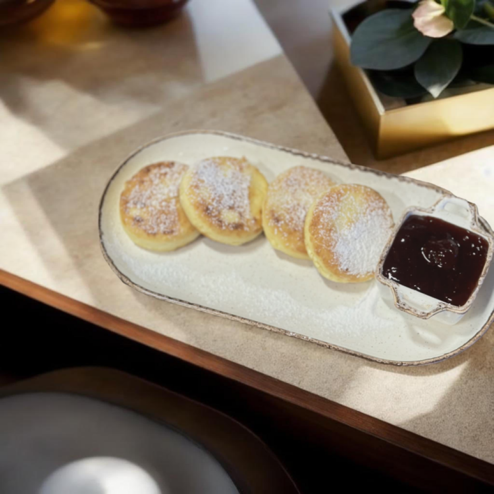 Вкусные творожные сырники - идеальный выбор для утреннего завтрака. Состав блюда: сырники, сметана, джем, сахарная пудра.
