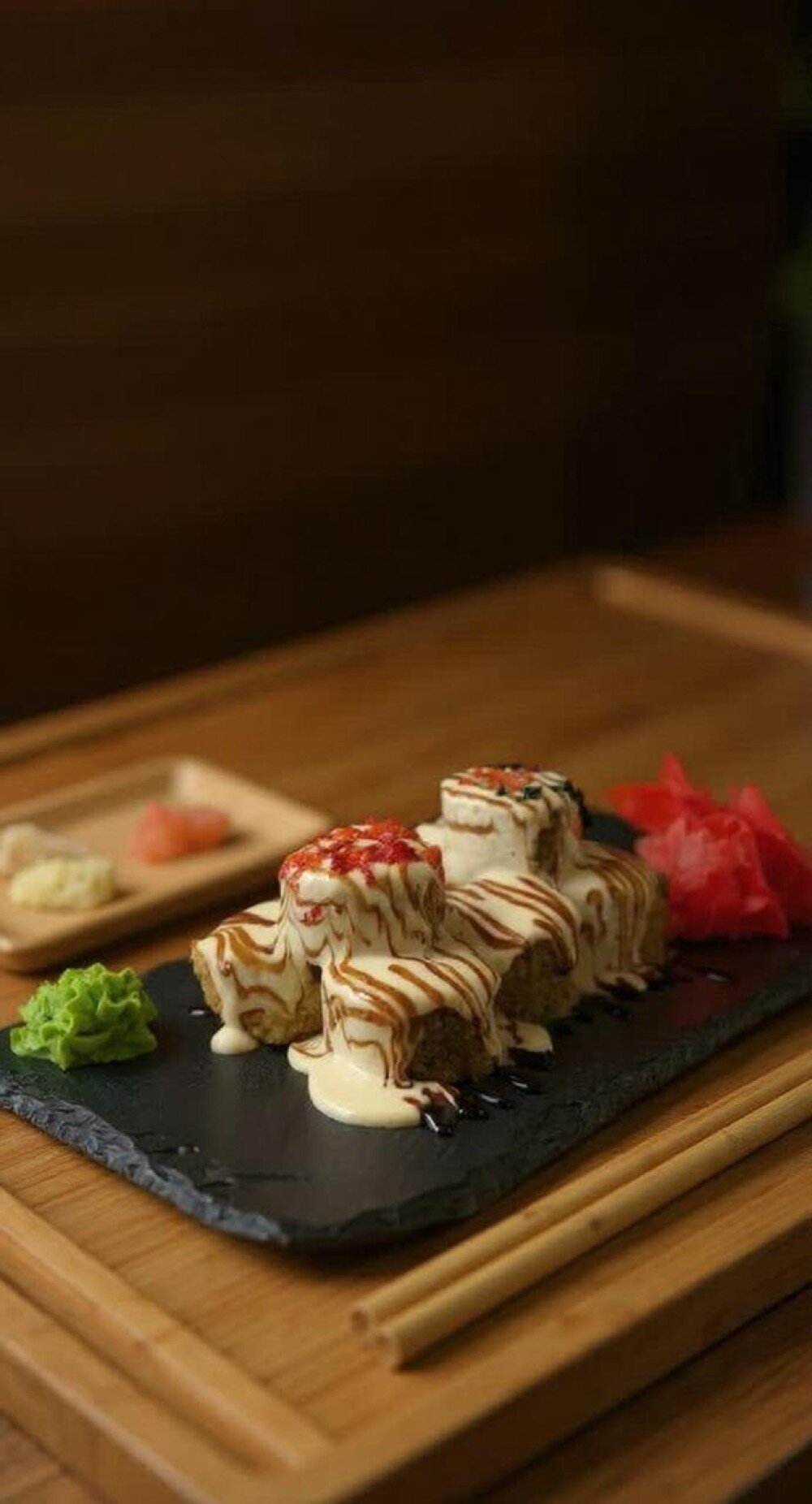 Состав блюда: рис, лист нори,курица, огурец,соус фирменный, кляр, унаги соус, икра масаго