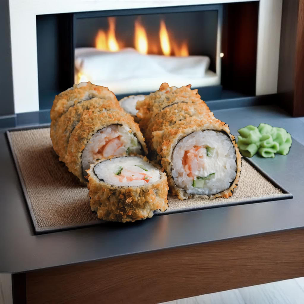 Горячая, вкусная агета с креветкой, лососем и золотистой панировкой - великолепное сочетание морепродуктов и текстур. Состав блюда: лосось, креветка, рис, лист нори, огурец, лосось, кляр, сухари панировочные.