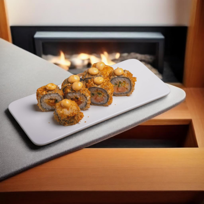 Новый горячий Шик - вкусное морское блюдо с лососем, креветками и хрустящим кляром. Состав блюда: лист нори, угорь жареный, икра тобико, лосось, огурец свежий, сыр творожный, сладкий соус, соус унаги, кляр.