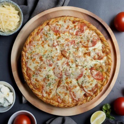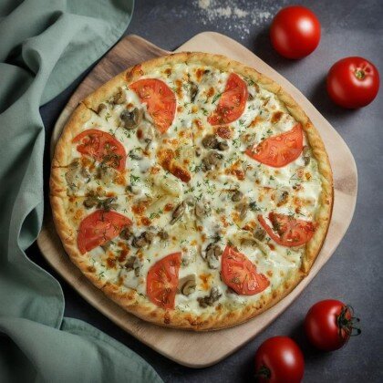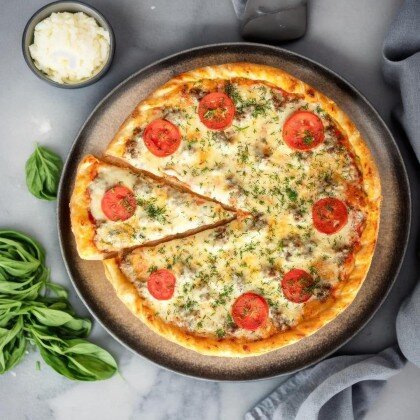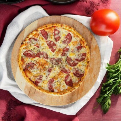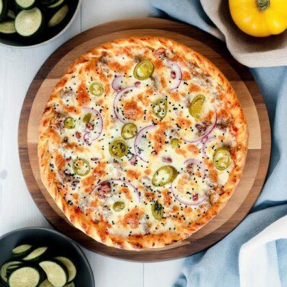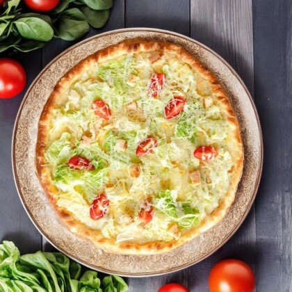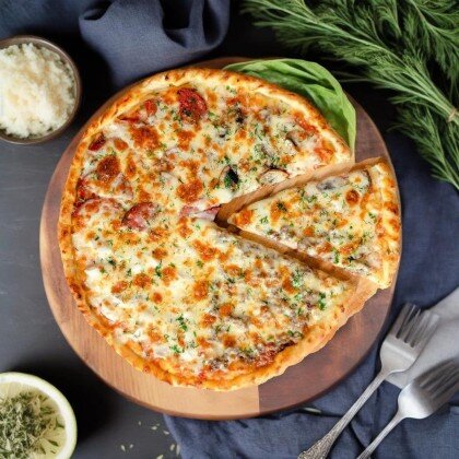 Сочная и нежная пицца с разнообразными начинками - настоящий вкусовой фейерверк. Состав: соус, фарш говяжий, филе куриное, шампиньоны, сыр моцарелла, помидоры, маслины, зелень, перец болгарский.