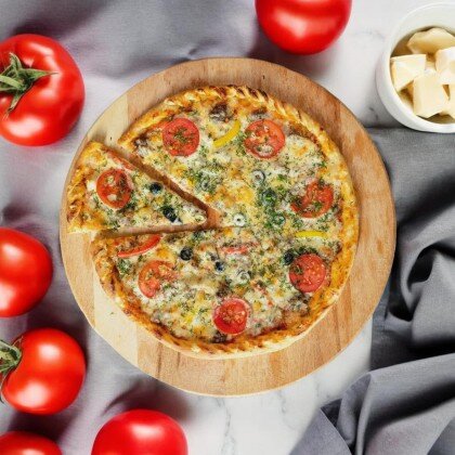 Сочная, нежная пицца 'Четыре сыра' — идеальное сочетание сливочности и ароматов разнообразных сыров Состав: соус сырный, сыр моцарелла, сыр фетакса, сыр чеддер, кунжут.