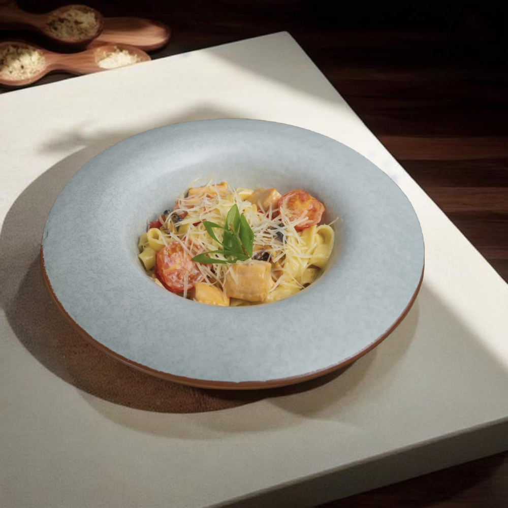 Горячий феттучини с лососем, сливками и пармезаном - вкусное изысканное блюдо. Состав: семга, черри, шампиньоны, сливки, фетучини, пармезан